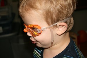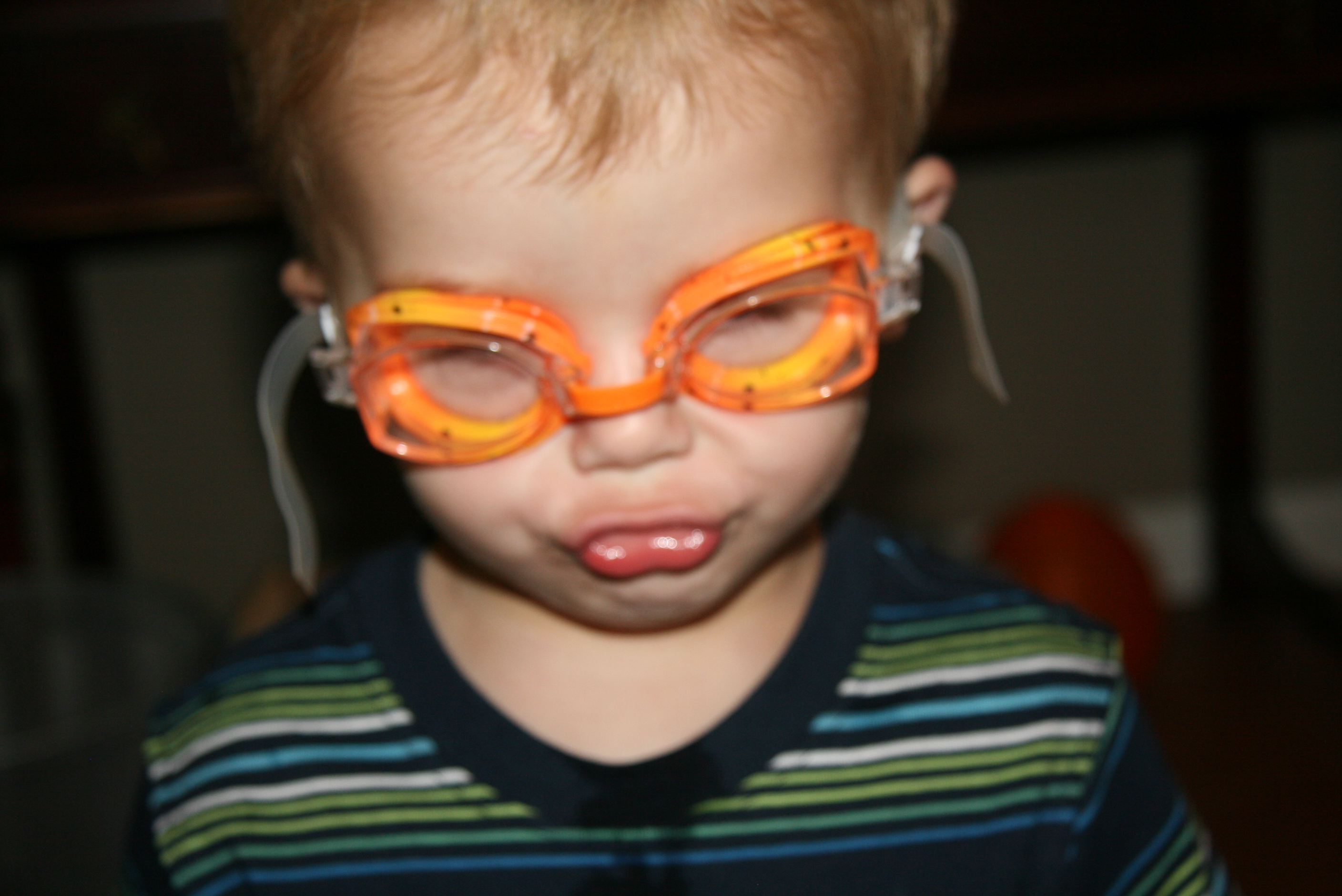 And now a little about Davey. We got him some new googles to wear to the water park. He loves them. The first photo is a little blurry, but I wanted to show how he always wants to hold his mouth as he gets used to his new goggles. I included a profile pic as well!
