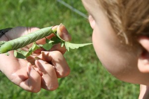 We went out to Glenwood yesterday to Mama Pearl’s. Davey promptly threw up as soon as we arrived, but after that he was fine. It’s a hilly curvy road to Glenwood, and I always get carsick, so I think that’s what happened to Davey too. But after that, he had a wonderful time. We looked for tomato worms in the garden. Pearl found one. They are huge! Davey was pretty fascinated by it.