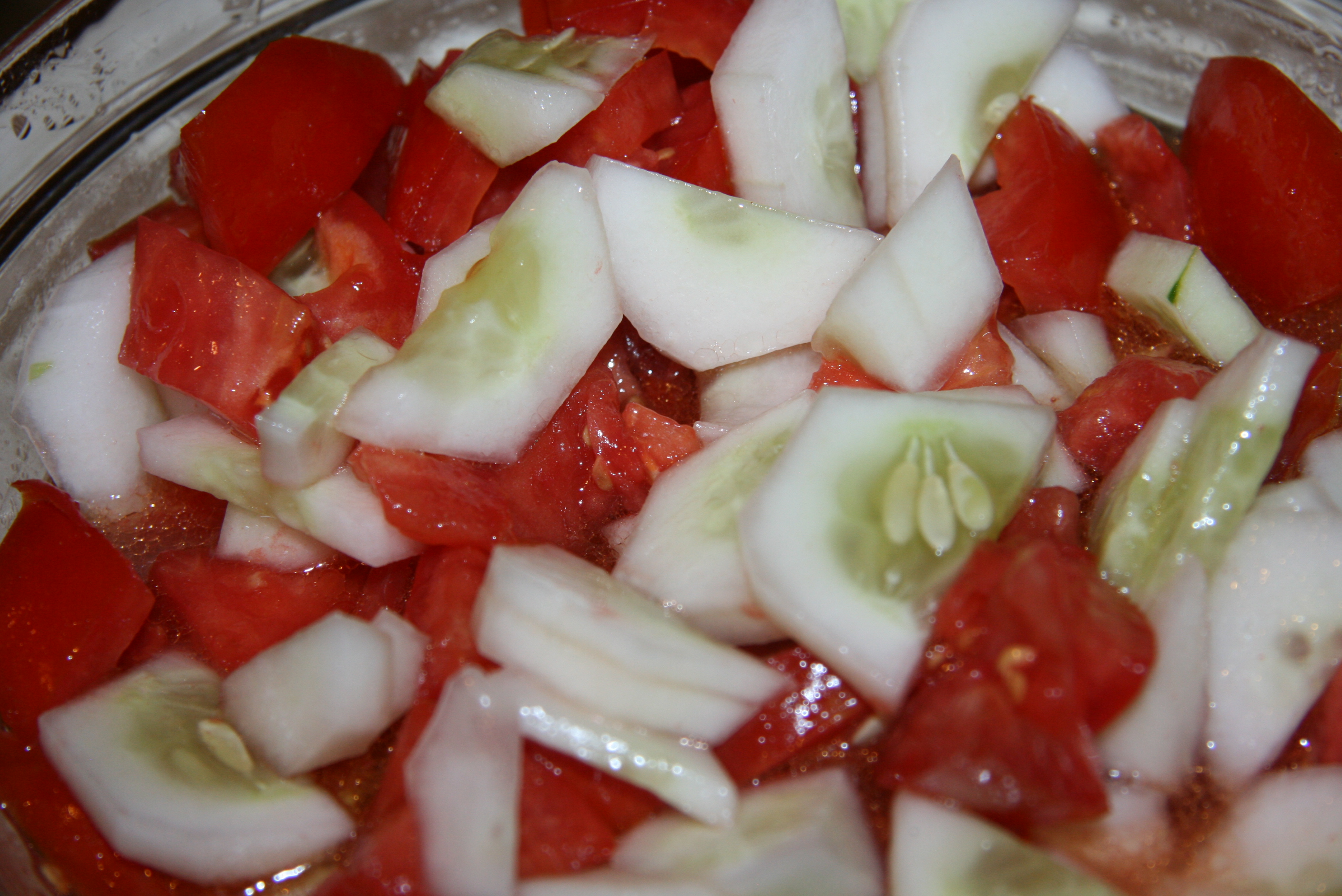We eat the cucumber and tomatoes with vinegar and oil. This is the best vinegar in the world to use on the cucumbers (thank you Jerry!)
