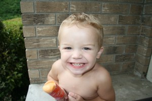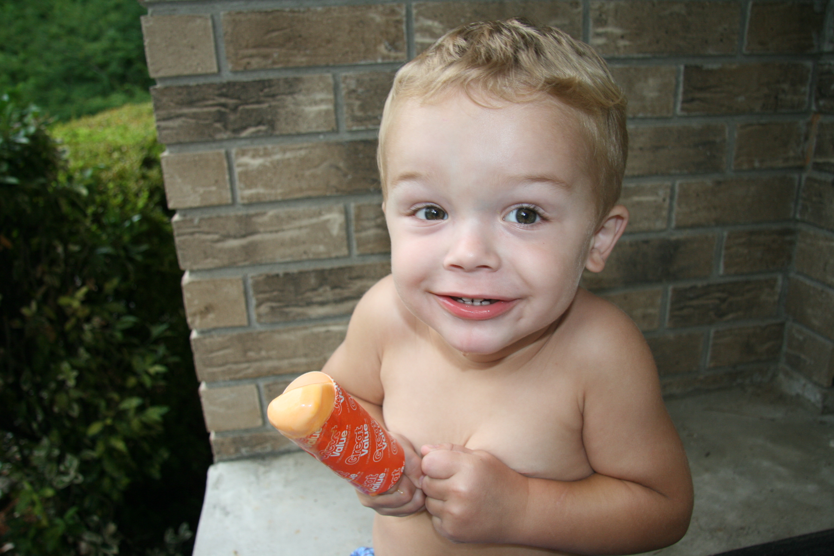 We went back to the front porch because our “popsicle chairs” (lawn chairs) were all wet.  It’s raining here.   In this photo Davey is explaining to me that his push-up is “Cool and Refreshin'”.
