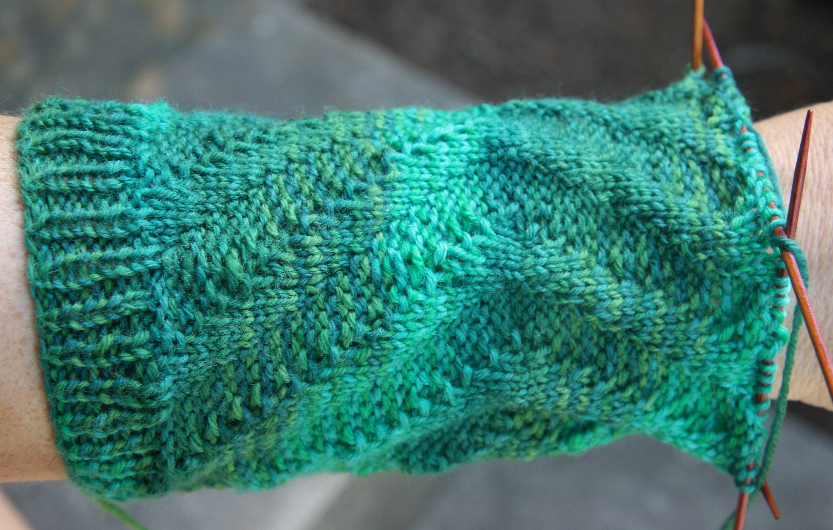 I started the Rock-a-Bye sock yesterday. It’s a diagonal rib so you just shift the knit and purls on each row by a stitch. It creates a neat pattern. The Rock-a-Bye sock that is photographed in The Joy of Sox is really pretty, but the photos don’t do the pattern justice. Here is what it looks like – and I love the greens of this sock yarn: