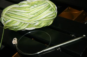 I began with the hook and some cotton. The plan is a potholder. Typically, I think the afghan hook is a long straight needle with a hook at one end and a stopper at the other. I wanted a size J though, and Hobby Lobby only had this circular looking afghan hook in that size. I like it fine though. I put the hook and cotton on my marimba to photograph it. Thought it looked kinda neat:
