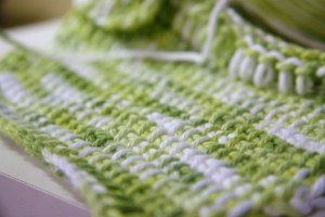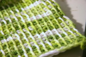I found some great youtube demo videos, and I learned that in tunisian crochet you pick up stitches all down the row so that at the end of the row you have many loops over the needle and it looks like knitting. You never turn the work. Instead, when you come back down the next row, you work all the stitches back off. It’s really very simple. (at least the basic stitch is.) And it’s pretty fun. I love the woven look too: