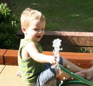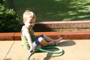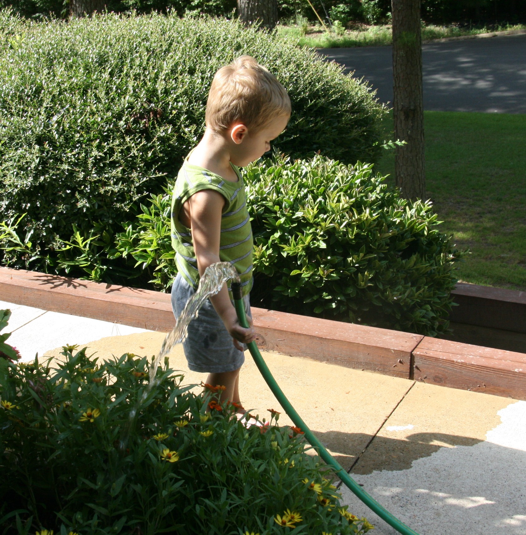 Davey and I watered again this morning. For Davey, watering ideally follows this pattern: Water the plants a little. Start playing with hose. Get soaking wet. Start watering everything but the plants. Then begin to think about watering Mommy. (that’s when it is time to head in.)