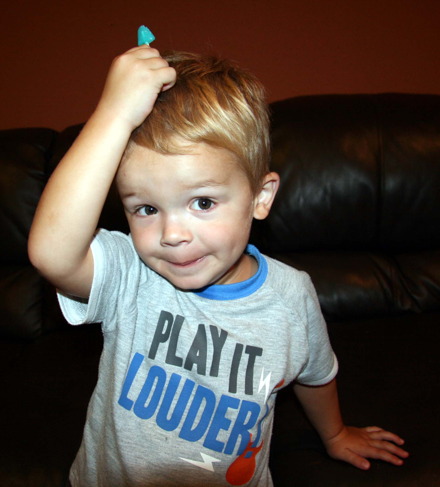 Of course this might have been the remnants of a sugar high, as I let him have a lollipop entirely too early in the morning. I wanted to take a picture of him with his sucker. He hid it: