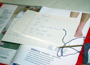 These socks have a lace pattern. I learned a wonderful way to knit lace or at least to follow the pattern. (Thanks to my friend Ronnie.) I write out each line of the pattern on a separate index card. The index cards on a spiral work best, or just a little spiral notebook actually, but I had some index cards to use. So I write the pattern down, and I arrange the line on my card in rows that kind of make sense to me. This may just look like a mess but it works well for me: