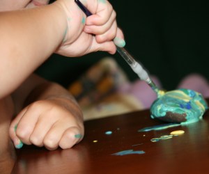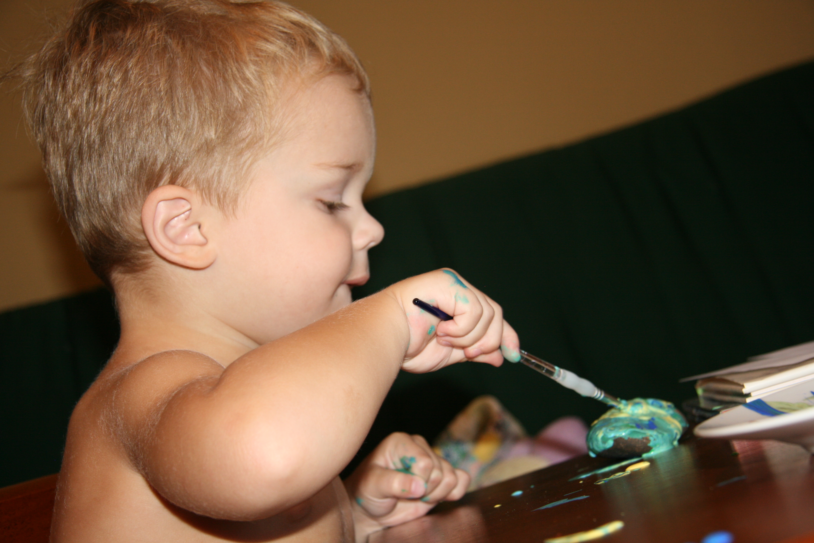 Davey and I painted river rocks yesterday. We need to go get some more because we just picked up a few. He gets his imagination involved so when he was painting the rock (and his hands and the table) he was actually putting syrup on his pancake. Davey is not afraid to layer paint. (I love it and it looked much cooler than the boring polka dots I put on mine. We’ve decided he will paint over my boring rocks. Give them some much needed character.)