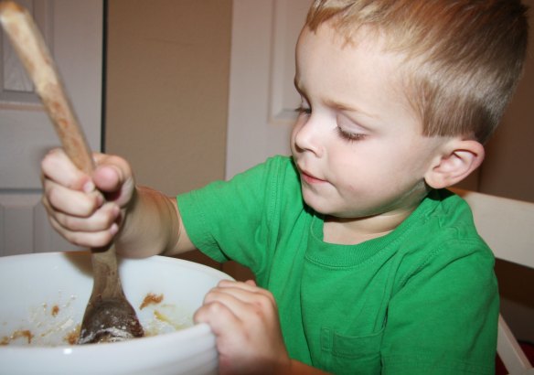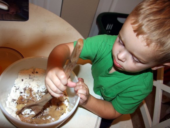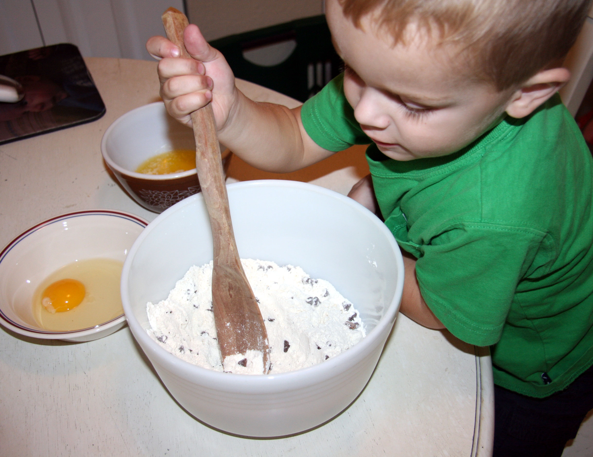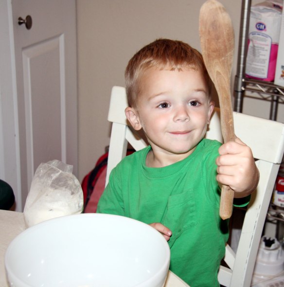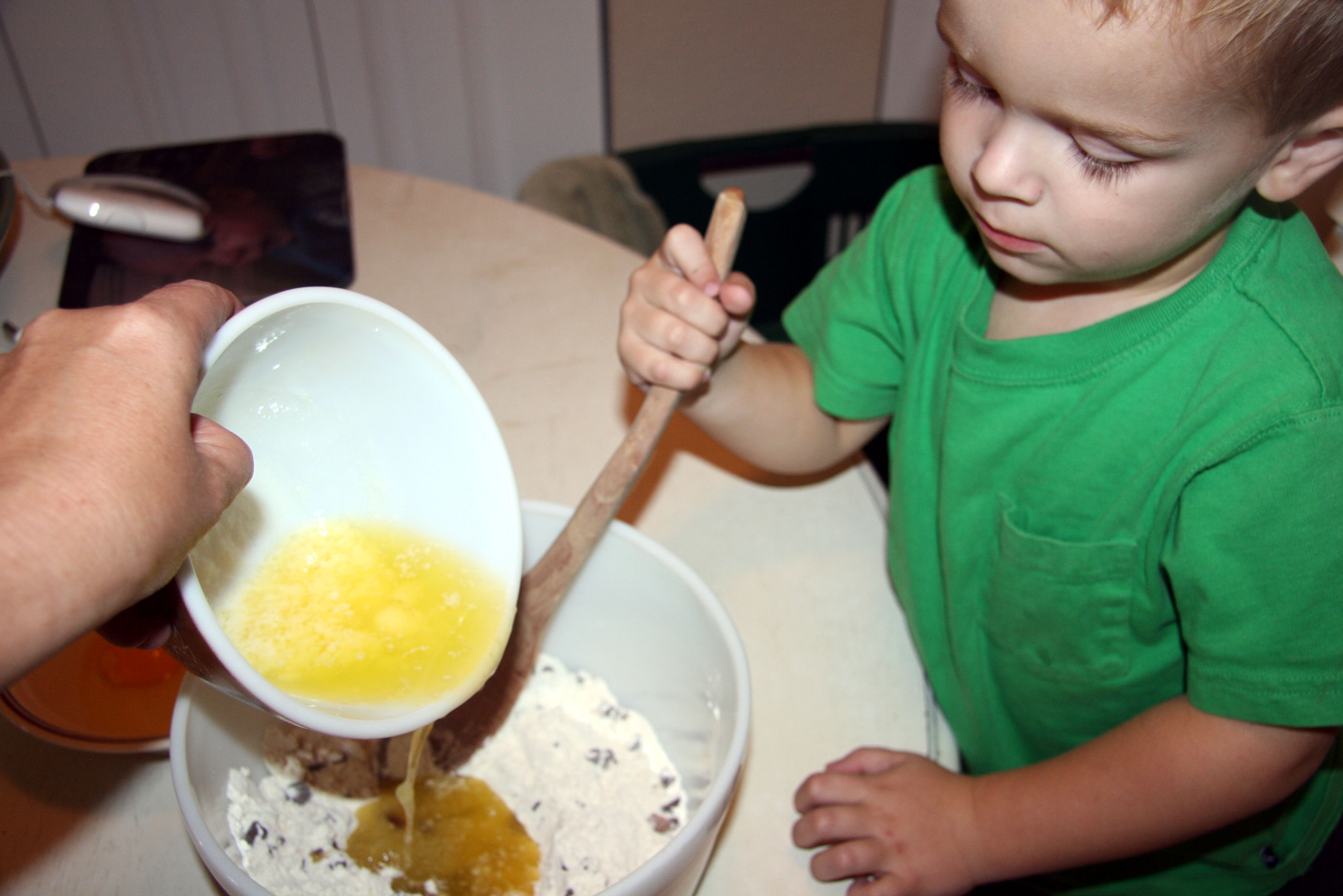We were working with a mix, so I set out the other two ingredients for him to add. He couldn’t wait to start stirring.