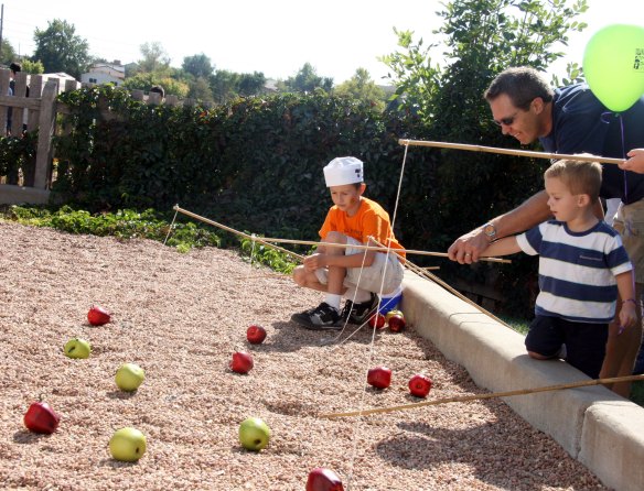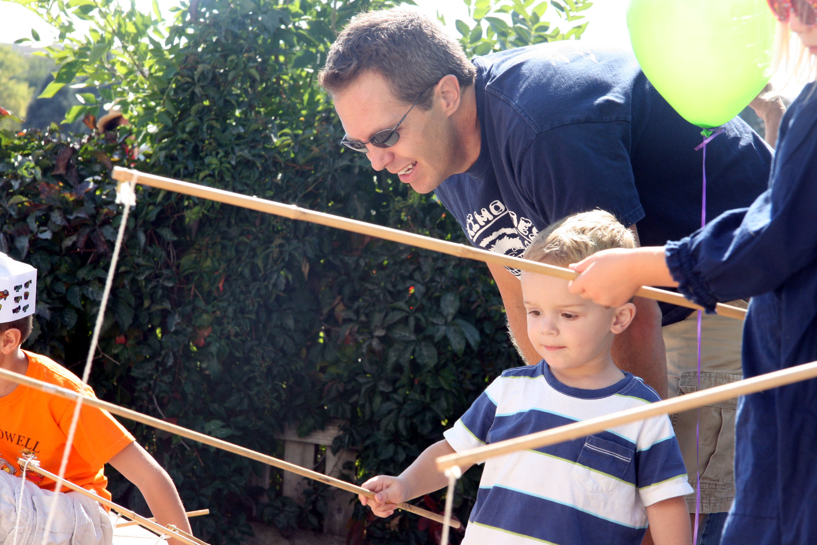 There was bean bag tossing. He was very determined. So much so that at first, he was just going to walk right up to the wall and make it a short toss. But then he stood back and threw some mighty good tosses! Here the red and green bag is mid-air.