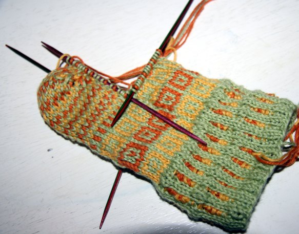 And I finally have to show some progress on my latest sock.  I am not sure what I think about it.  I think it’s pretty, but I am not crazy about the heel.  It’s a kind of flappy short row without the wrap and turn?  Now there’s some knitting lingo that makes no sense.  I am not sure.  Cotton may not have been the best idea, but I love cotton socks.  We shall see.