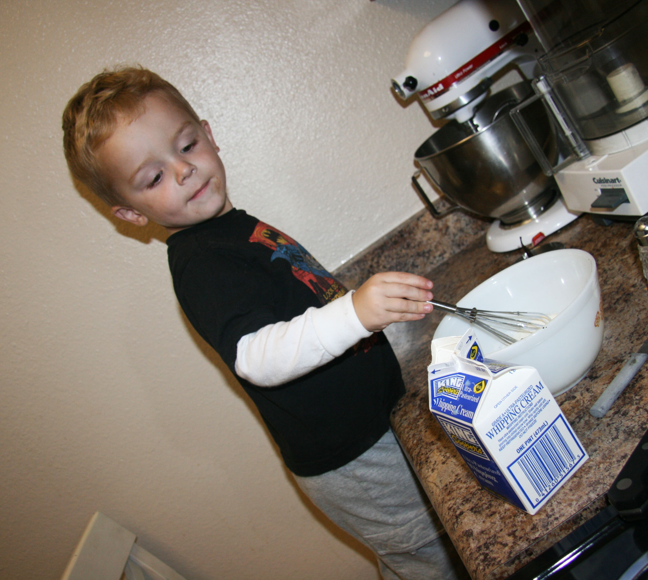 We had to split the vanilla bean and scrape out the “caviar”.  It is like little teeny tiny black dots.  And it smells so so Vanilla -ey!  We both loved smelling the beans!  We scraped out the caviar and mixed it in with heavy cream.  See – it is a wonderful recipe already!
