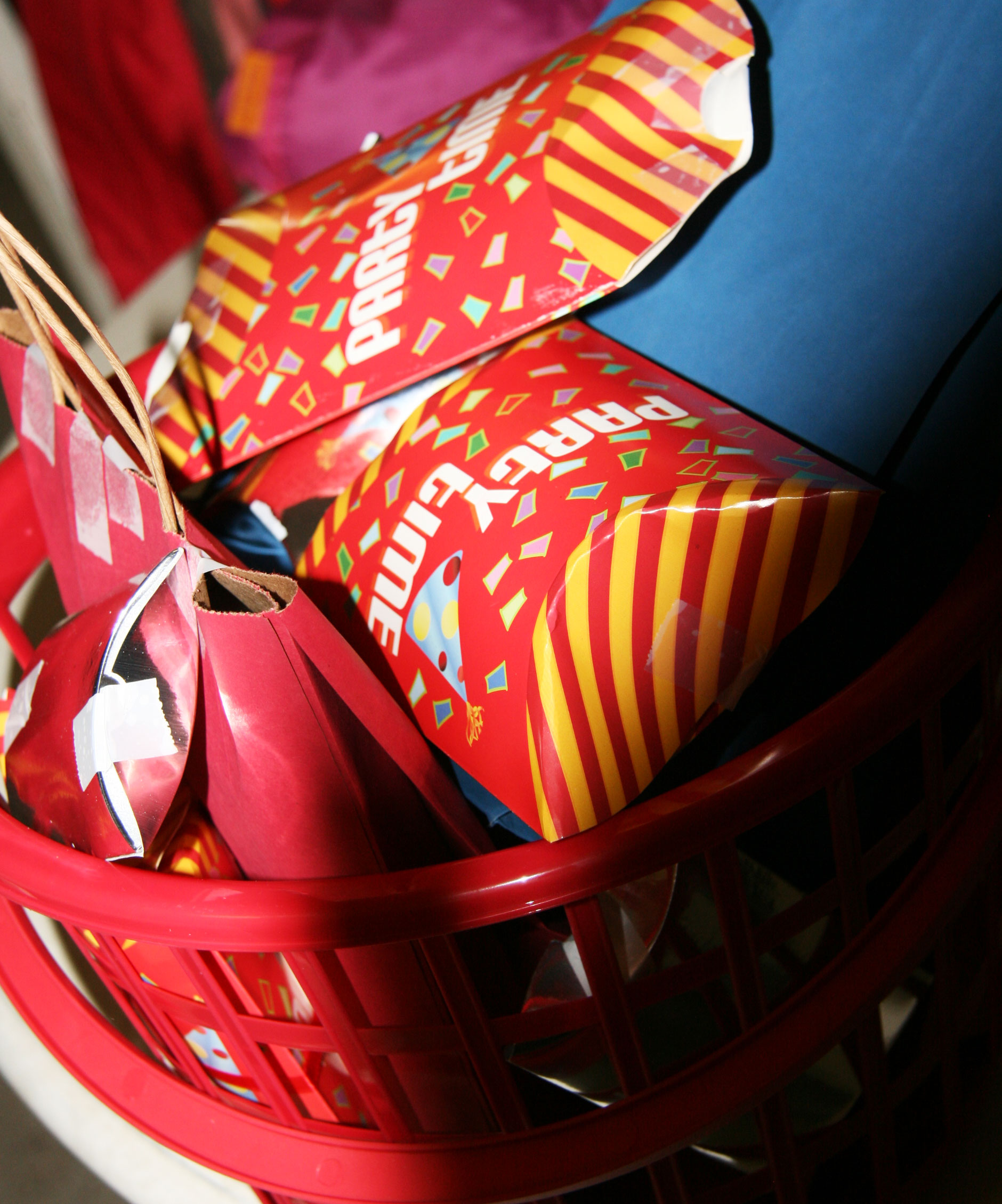We went to Dollar Tree and stocked up on a bunch of little toys. I wrapped them all in little assorted boxes and bags. We found all sorts of little fun things that we thought he’d enjoy playing with. Here’s a not so good picture of our basket of surprises. An indication of the success of this endeavor can be seen from all the tape as we have re-used these packages several times already.