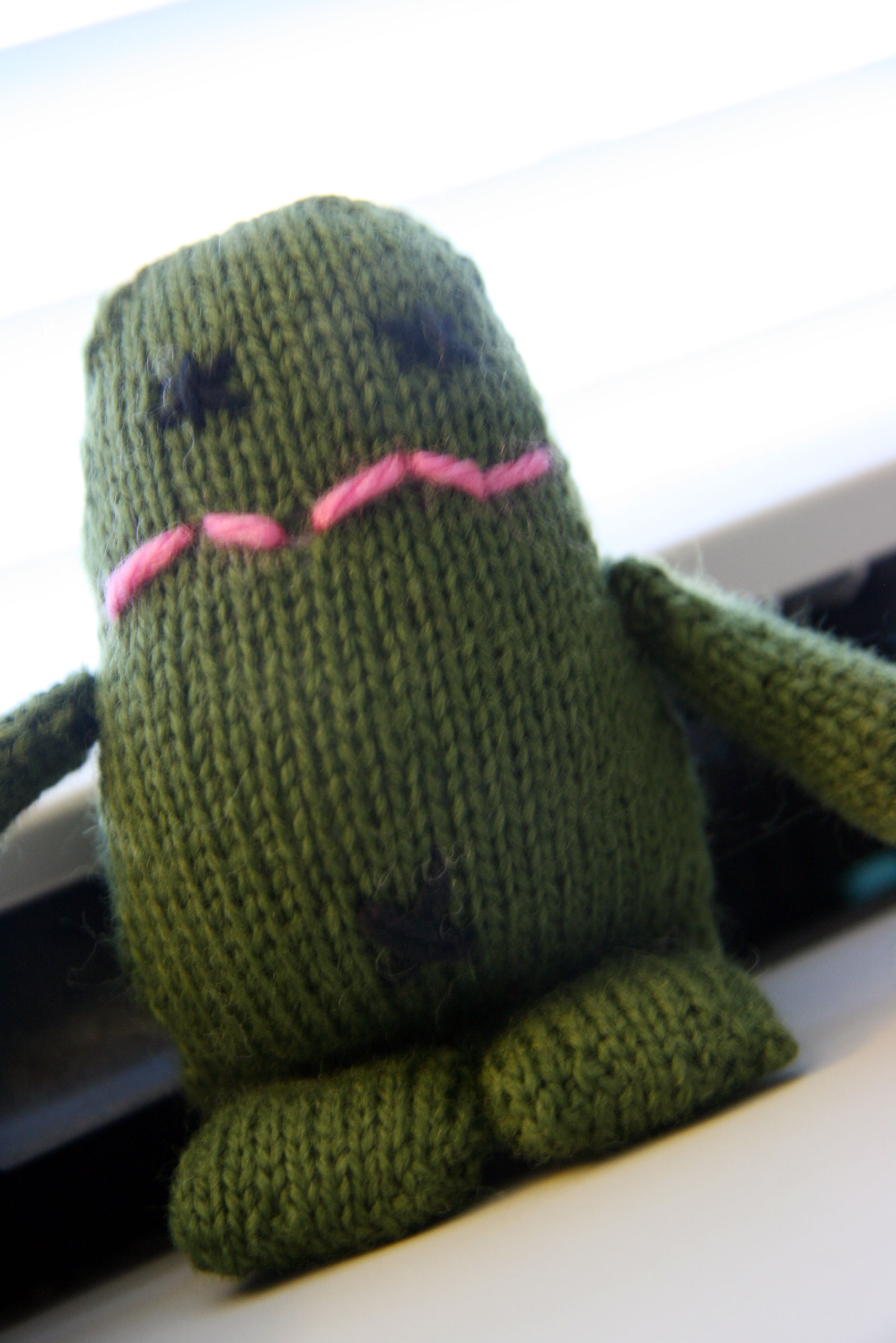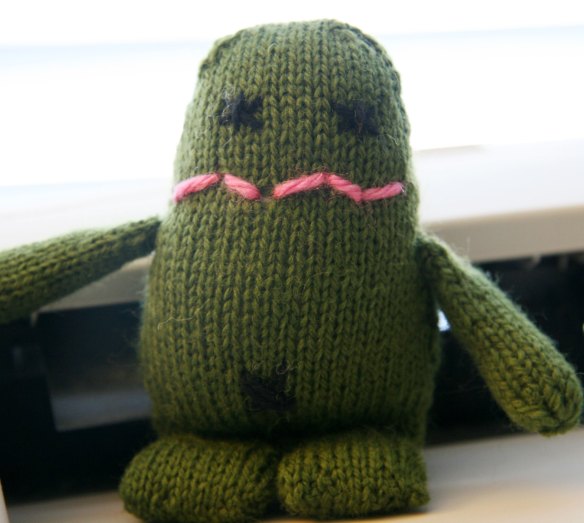 This morning Davey helped me finish making this little monster.  He was my creative director.  I put eyebrows on this little guy at first, but Davey asked me to take them off because they made him look mad.  Then he decided that he did not like this one at all, and he wants a red one. He did name this little green guy “Cutie”.