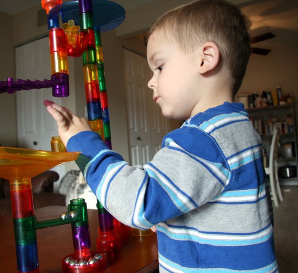 While David was running, Davey and I built this structure.  It was my first time.  I am not very good at it.  You run the little marbles through, and mine kept showing up at the most unexpected and wrong places.