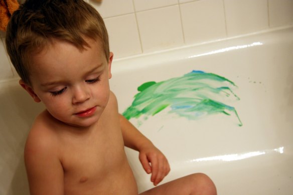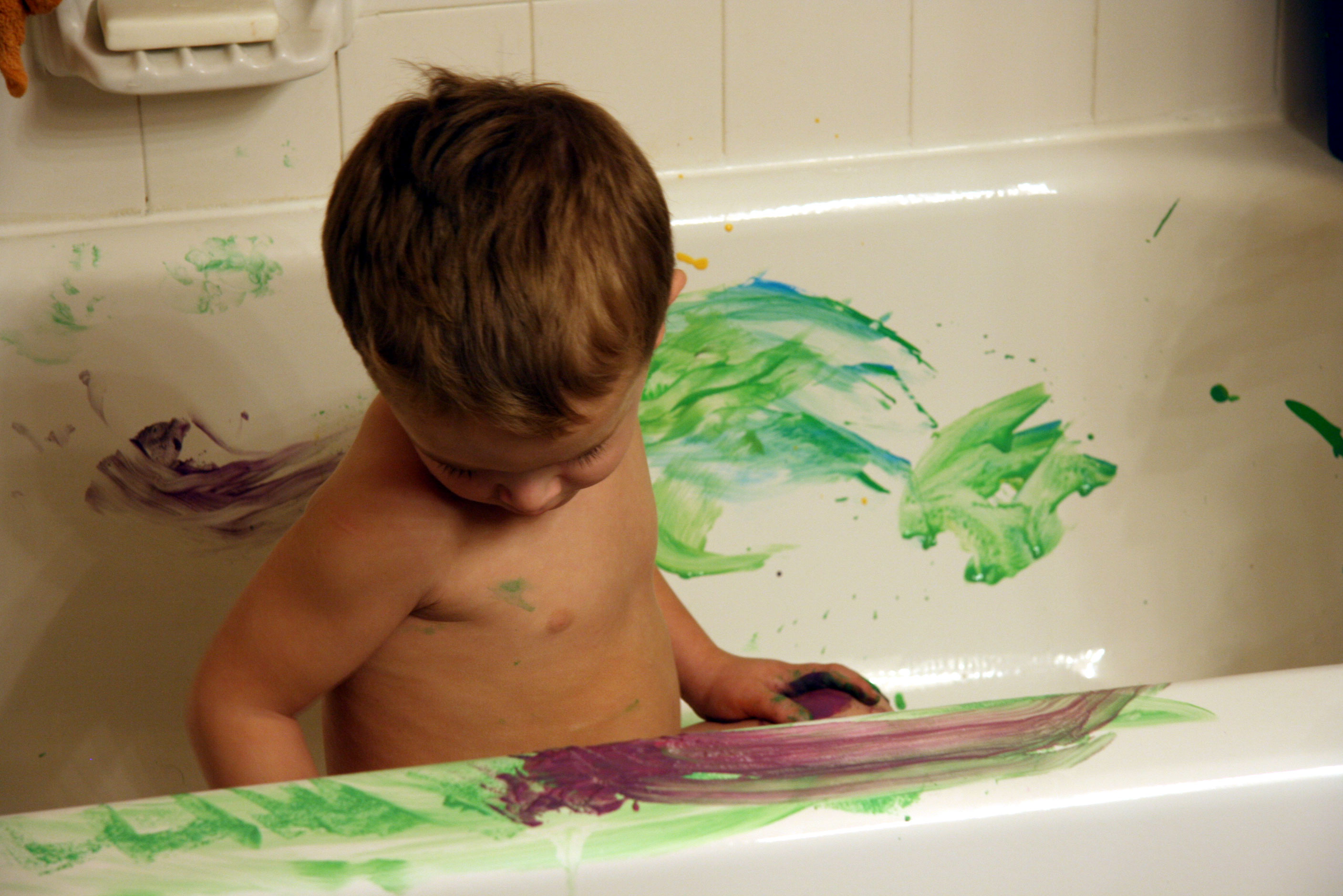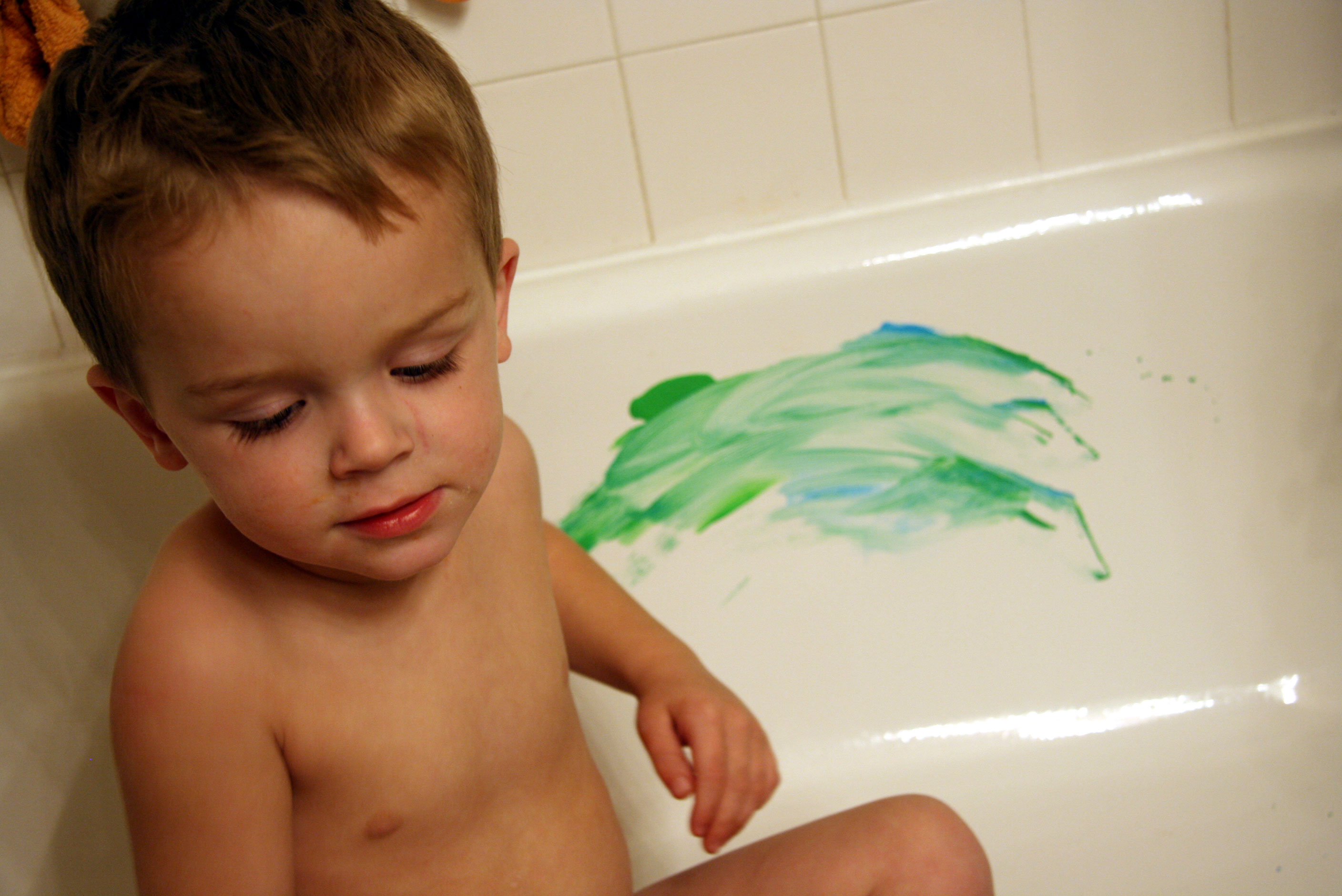 The other day one of my students surprised me with some finger paints for Davey. She told me that when she was a kid, her mom would put her in the bathtub and she would paint and paint in the tub. It was a great idea (and so thoughtful of my student). Davey loved it.