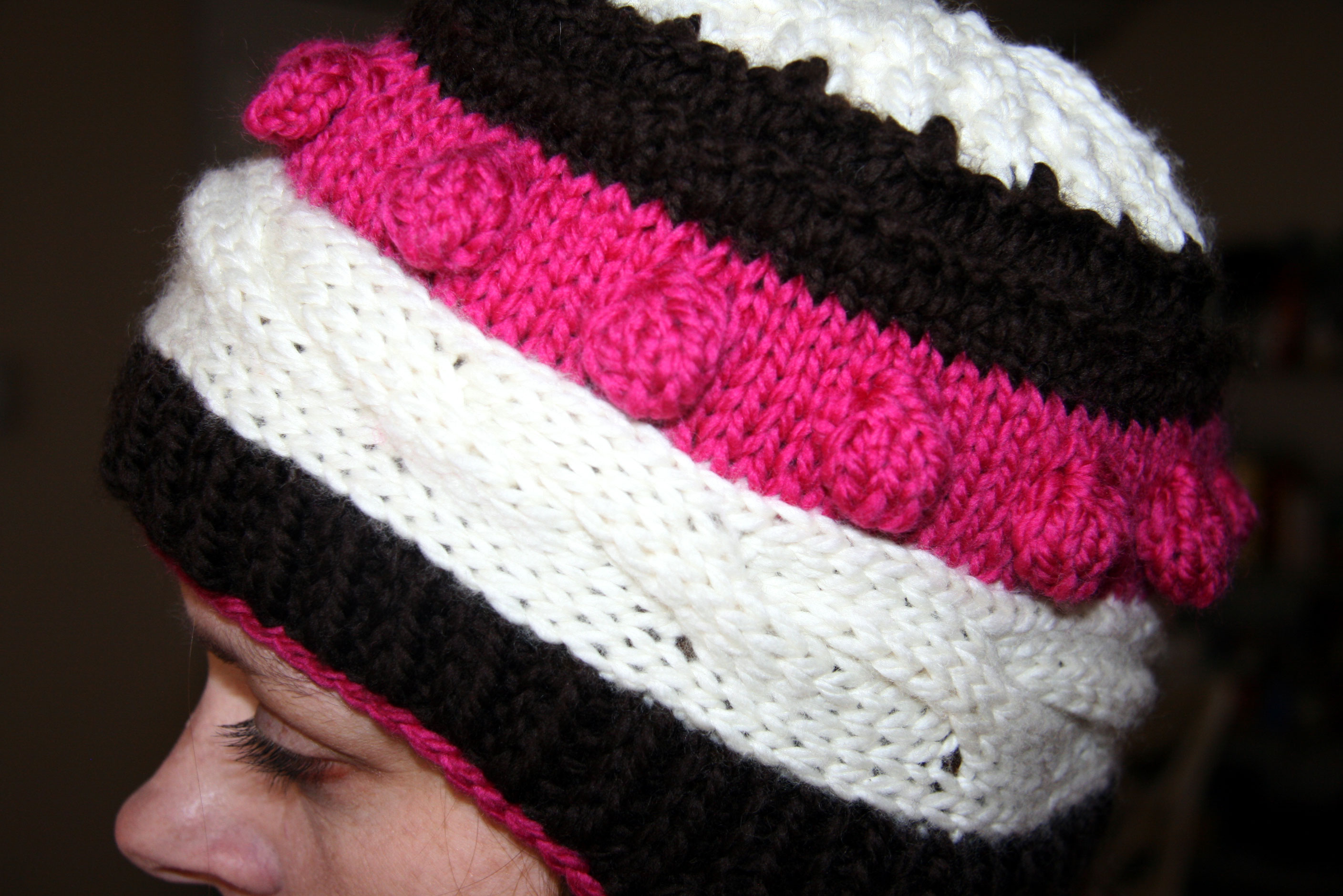 I’d wanted to try a hat with earflaps. They were easy and fun to knit. I loved doing the crochet slip stitch edging in strawberry as well.