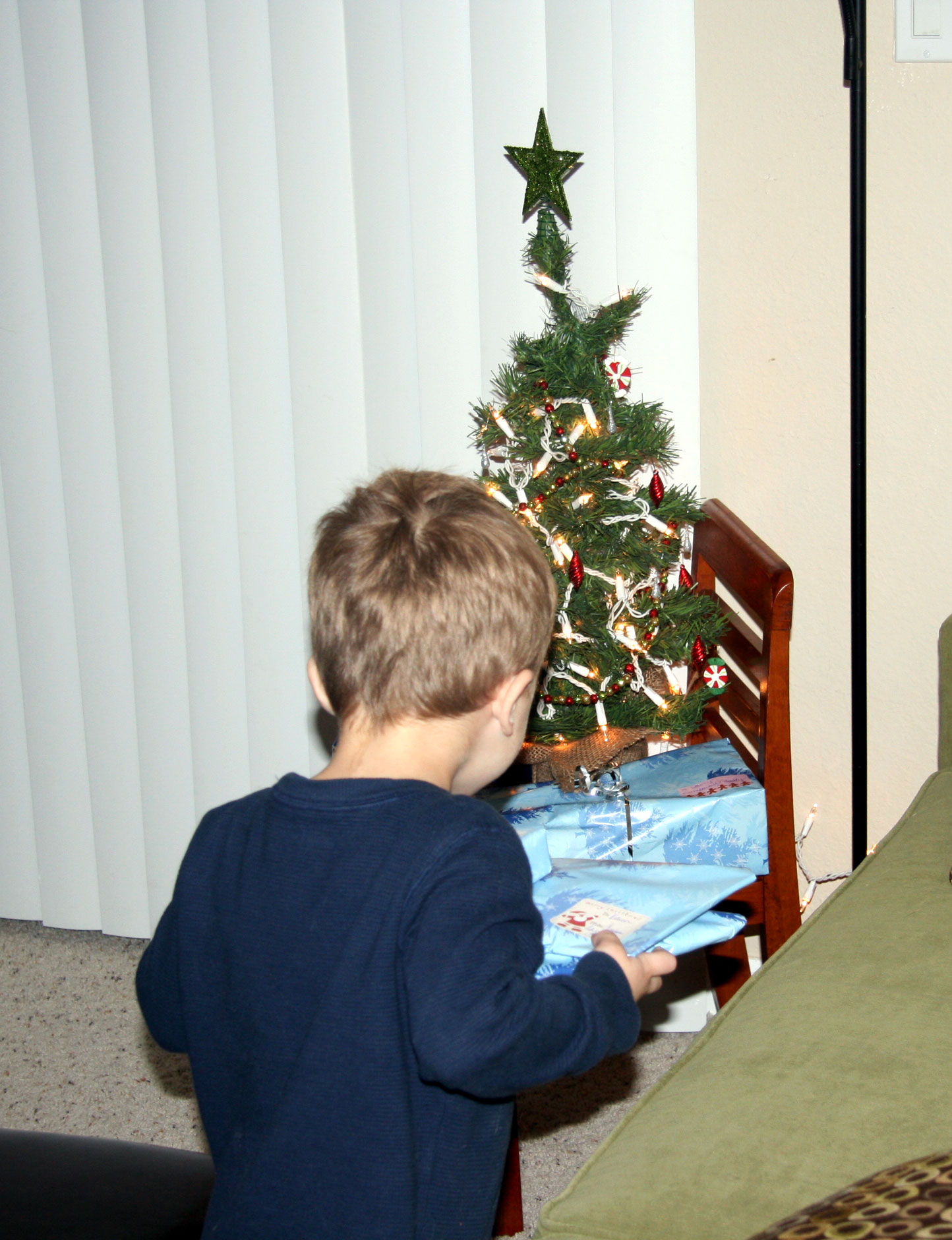 Yesterday we put up the tree. It’s small. Very small. I think I’ve mentioned that Timber, our Siberian Husky, thinks that all trees are trees regardless of where they are situated. So they are all fair game for the raising of his leg. So this tree is above his leg raising capability. But Davey was so excited about our little tree. He’s been waiting for me to wrap so he can put more presents underneath it.