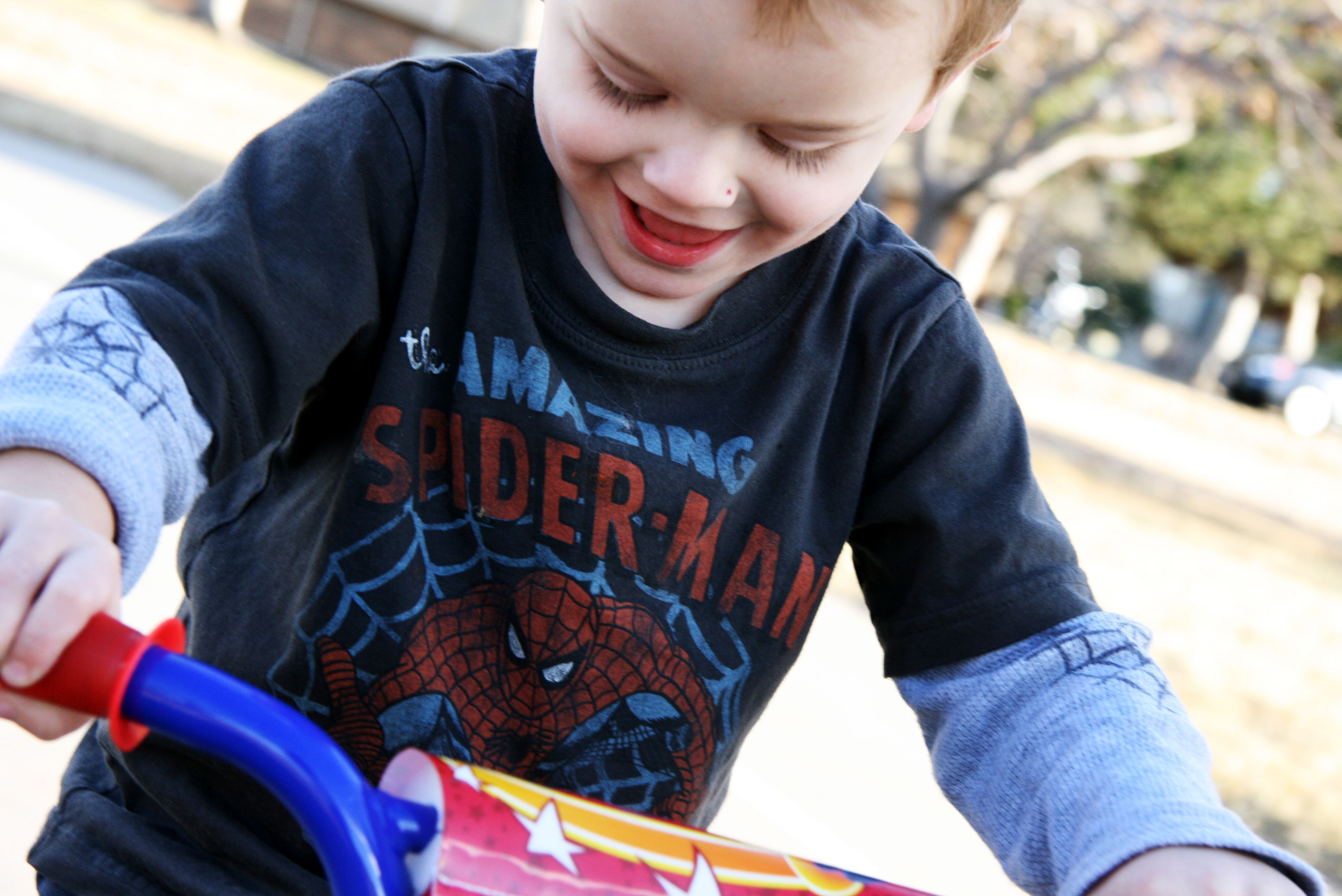 And then he decided that bikes are multi-purpose vehicles. (He tends to find multiple uses and variations for all his toys.)