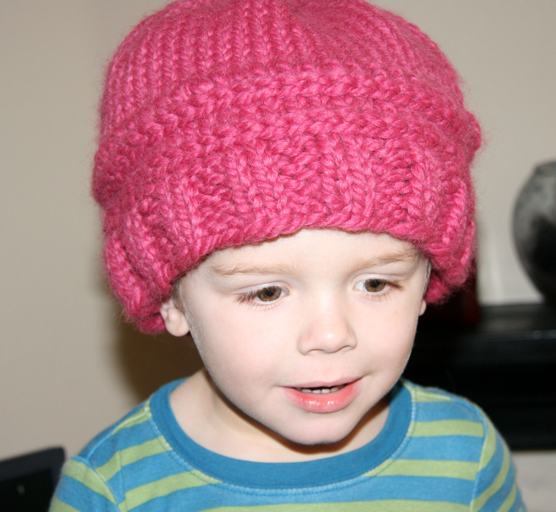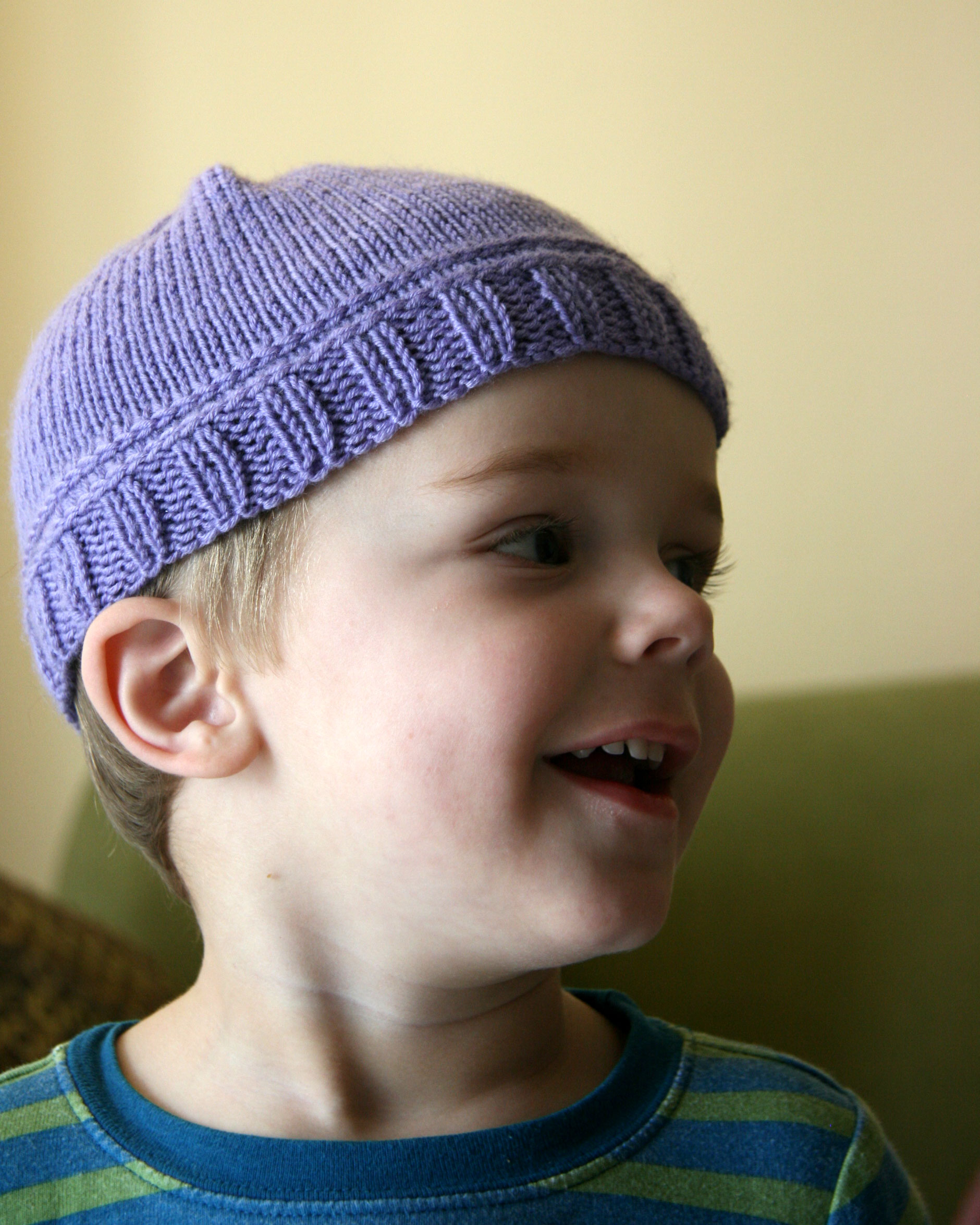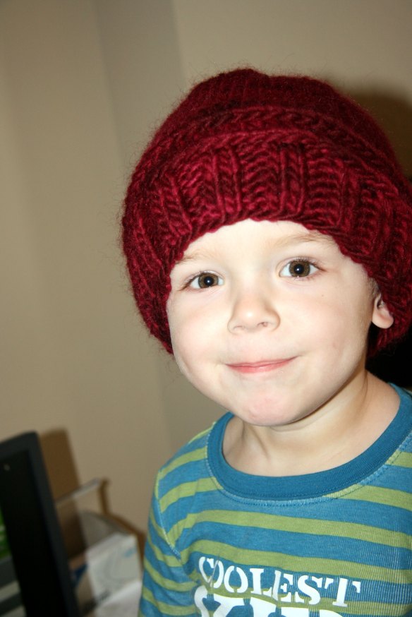 So finally I knitted one that should fit a 1-2 year old.  I really liked this one too, particularly because I used Debbie Bliss cashmerino.  It’s really nice to knit with and knits up so pretty.  I did put it on Davey’s head, but it’s a beanie on him.  I like this photo.  Pretty light.