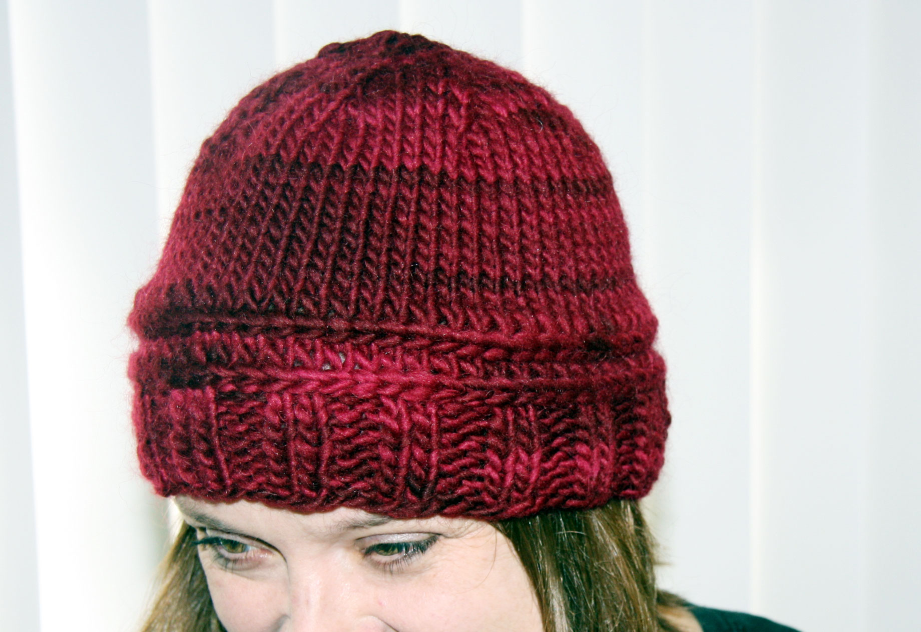 Next I knit in just a bulky yarn.  This is the yarn that I am using for The Sweater.  Lamb’s Pride Bulky.  I actually liked the blech hat a lot more until I knit it with this wool/mohair blend.   And I really like this rich color too.  So this was immediately my favorite.