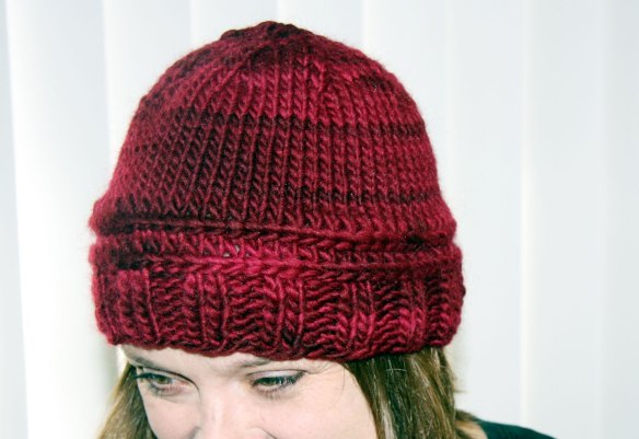 So I made my first hat with an extra bulky Lion Wool-Ease yarn.  I didn’t like how it knitted up.  For one thing it’s huge.  For another, I don’t like the look of this acrylic/wool blend.  At least not for the hat.  It might be great in a different project.