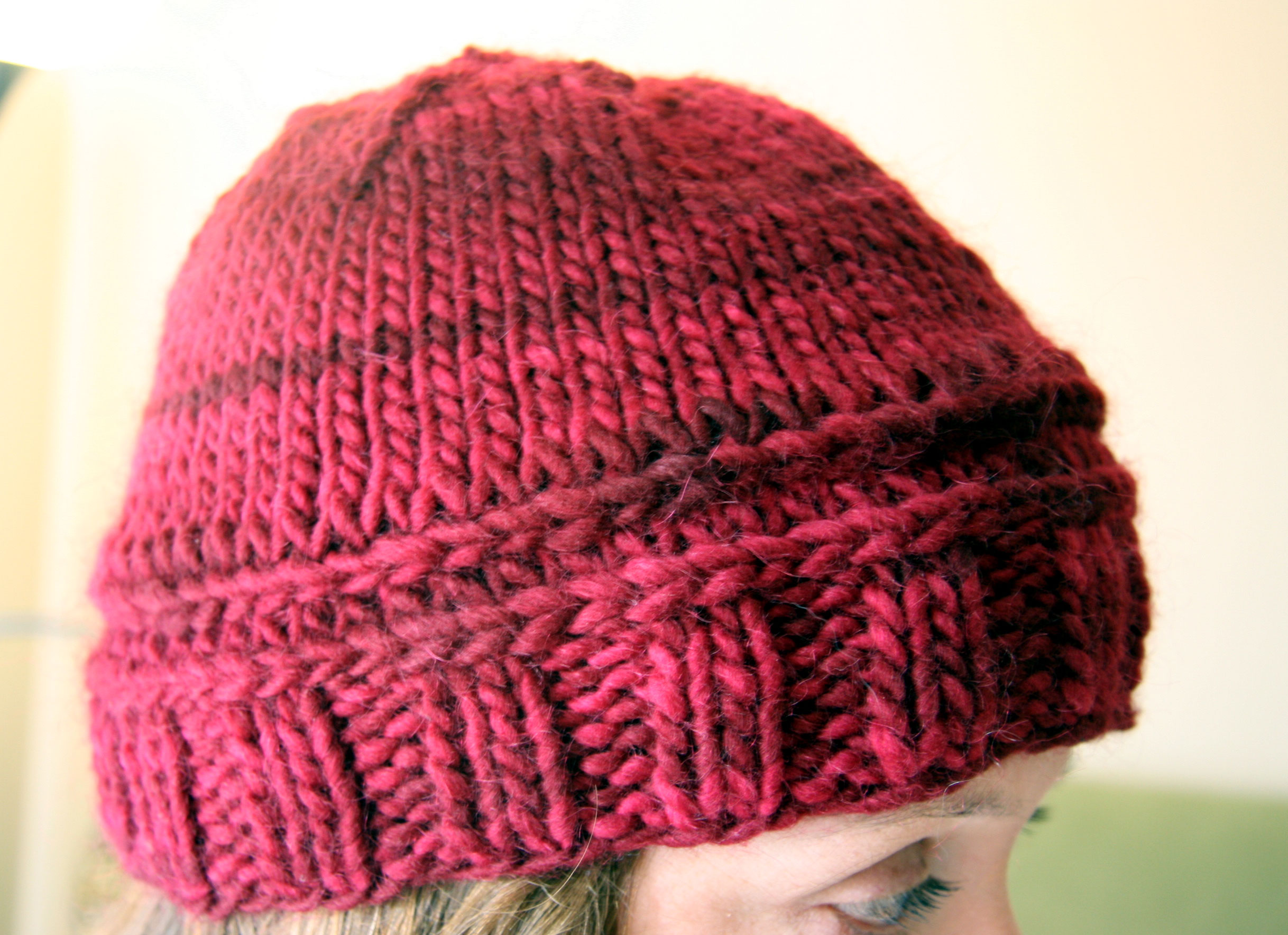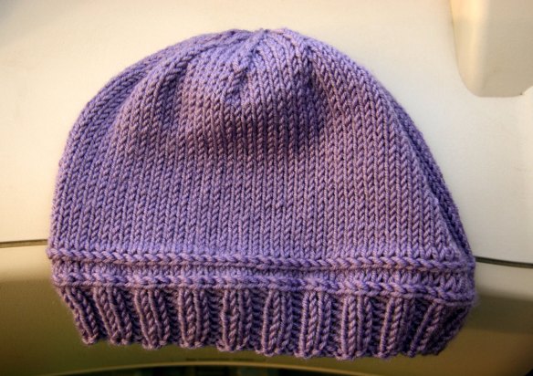 I’ve been having fun “designing” my own hat.  To say I designed it is a bit of a stretch, because it is basically a stockinette hat with just a small variation.  However, I really like how the lateral braids look, and how they change the look of the basic hat.