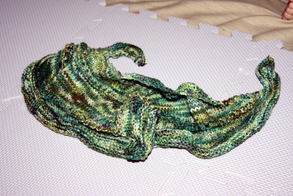 So here is the shawlette/kerchief post knitting but pre-blocking. It’s all curled and shrunk up and looks more like the size of a hankie then a kerchief.
