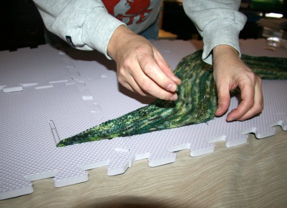 That’s a pretty shawl! I love the name of the pattern, too. My girls used to have big foam squares that had alphabet letters in them — I gave them away, not realizing then that someday they’d be the perfect blocking surface.