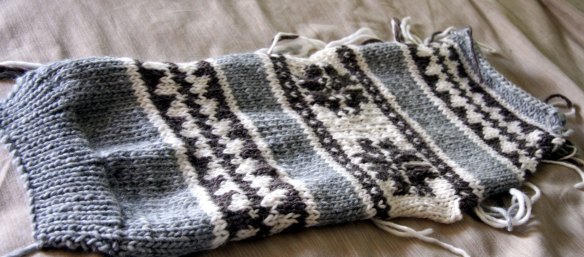 I thought I finished the left front of The Sweater last night. I did the bind-off. I asked David to stand up and help me position the back and the left front on him. It was looking pretty good. So I’d decided that I was going to knit the sleeve next to fit that side – just to see how it is all going to come together.