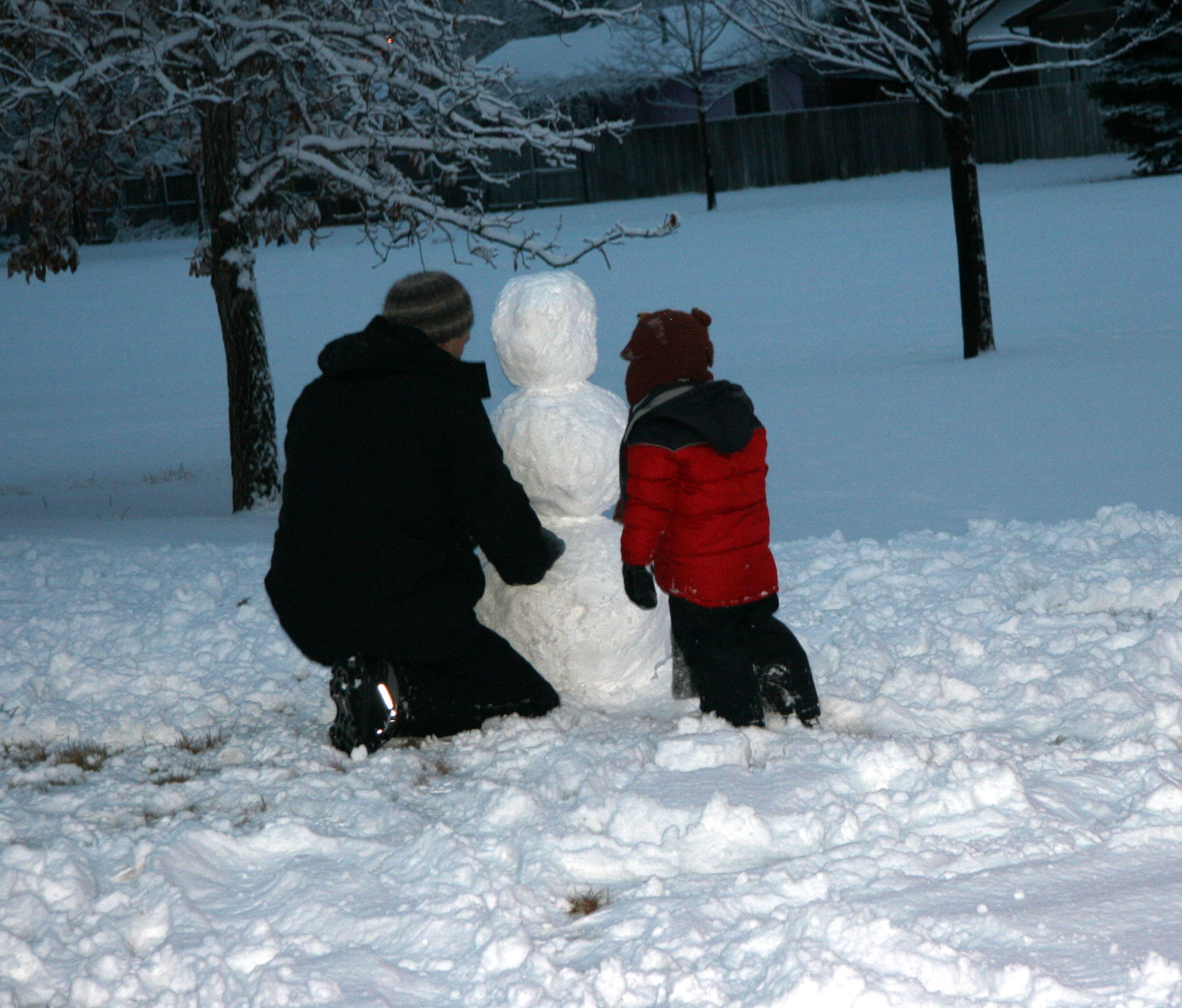 Late this afternoon, we all decided to go take the dogs out.  Once outside, we realized that this was a wet snow unlike the dry unpackable snow we had experienced up to this point.  So David took the dogs in, he came back out, and we started snowman building.