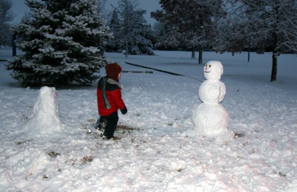 2. My daughters (who are older than Davey) made a blob of a snowman 2 weeks ago. In their defense, it was the first packable snow we’ve had in a couple of years and I had nothing to offer in face-making supplies except an apple and some stones from the driveway. They got bored quickly and just put sticks standing up on top of his head like spiky hair and christened him a minion (from the Despicable Me movie).