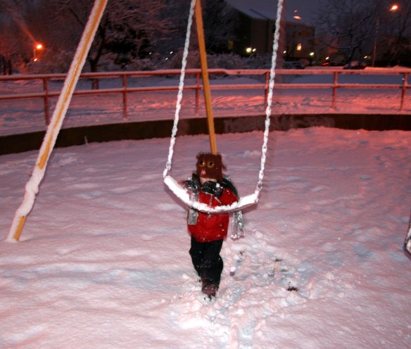 And finally he wanted to swing.  It was a little slippery for him to stay on the swing, so he decided that he wanted to swing Lucy.  Being an imaginary dog, she was somehow able to hold on, and she had a great time.