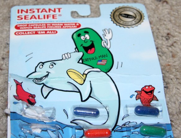 You drop these little capsules into warm water.  As they dissolve, sea creatures emerge. (If you’ve never seen them before, they are tiny sponges shaped like sea creatures encased in this dissolving capsule.  Pure genius!)