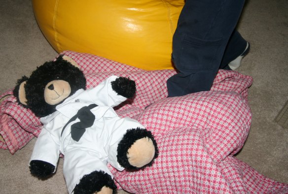 Davey prepared her bed. He spread out a quilt and brought in Winkie the Bear.