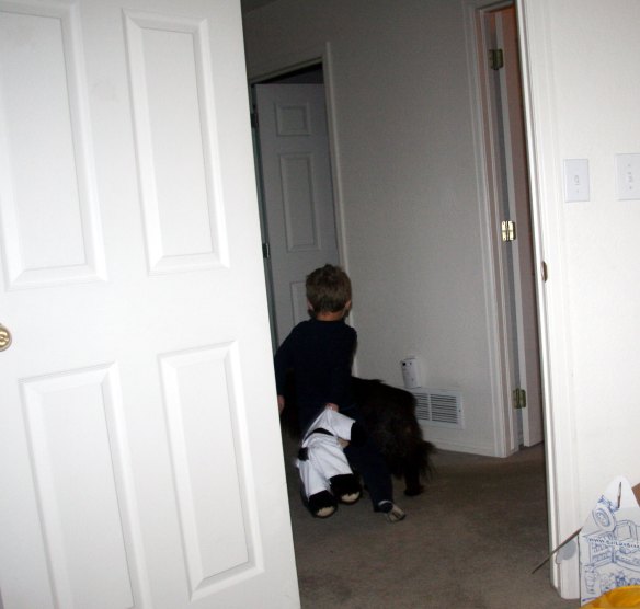 A few minutes later, David and I heard Davey talking to Koko. They were downstairs. Davey was holding up a picture of Koko and Timber. He was saying something like “Isn’t this so so precious?” I couldn’t find the picture on my computer so I took a picture of a picture.