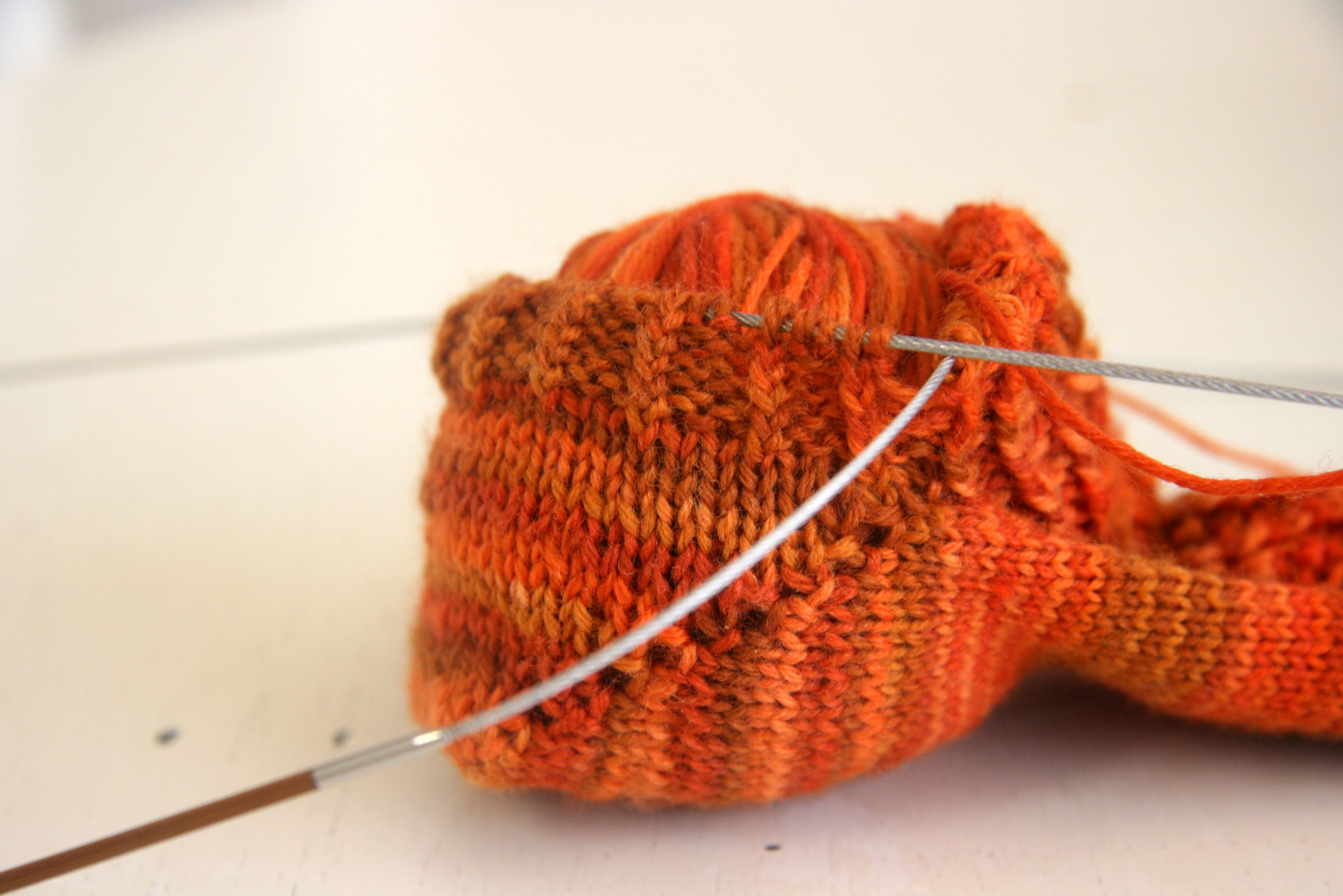 And I have turned the corner. I am on the homestretch (pretty much). (I am not thrilled with my heel. I have some trouble when it comes time to pick up and knit the wraps. Oh well – more practice.)