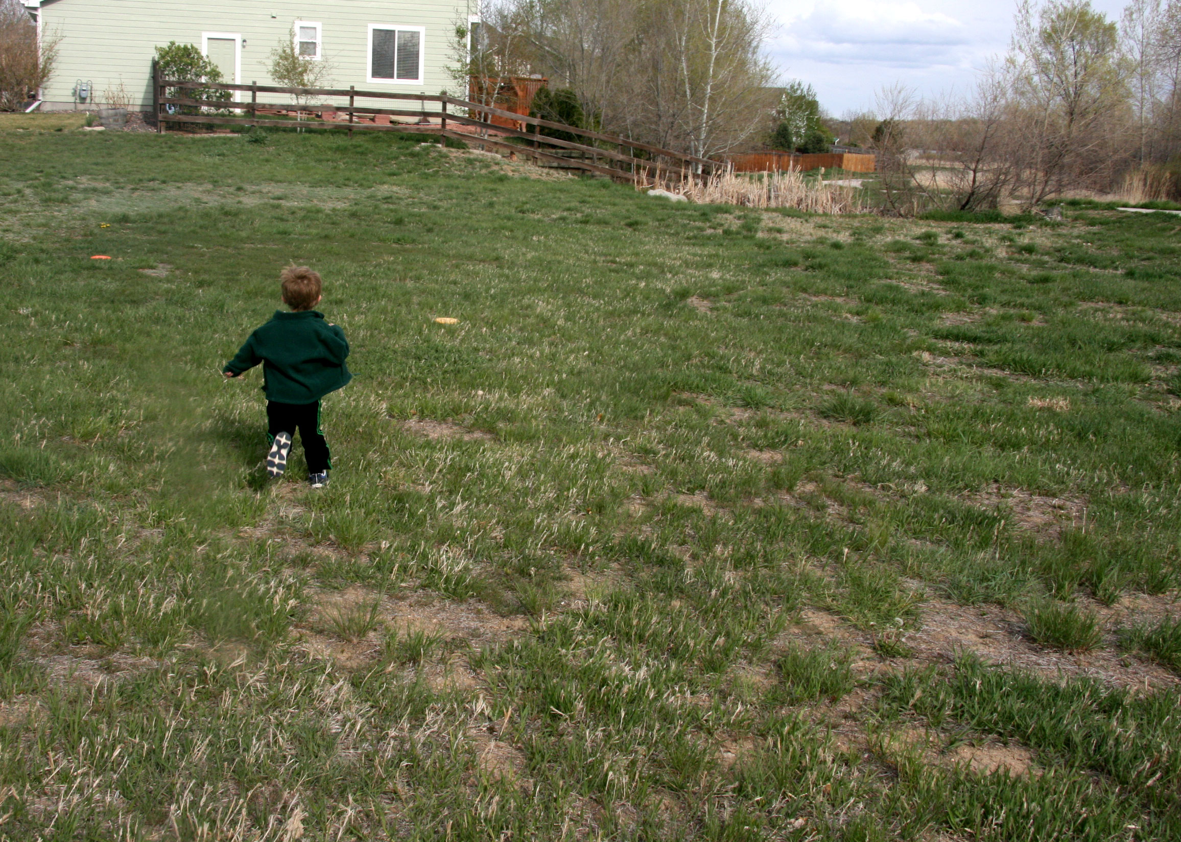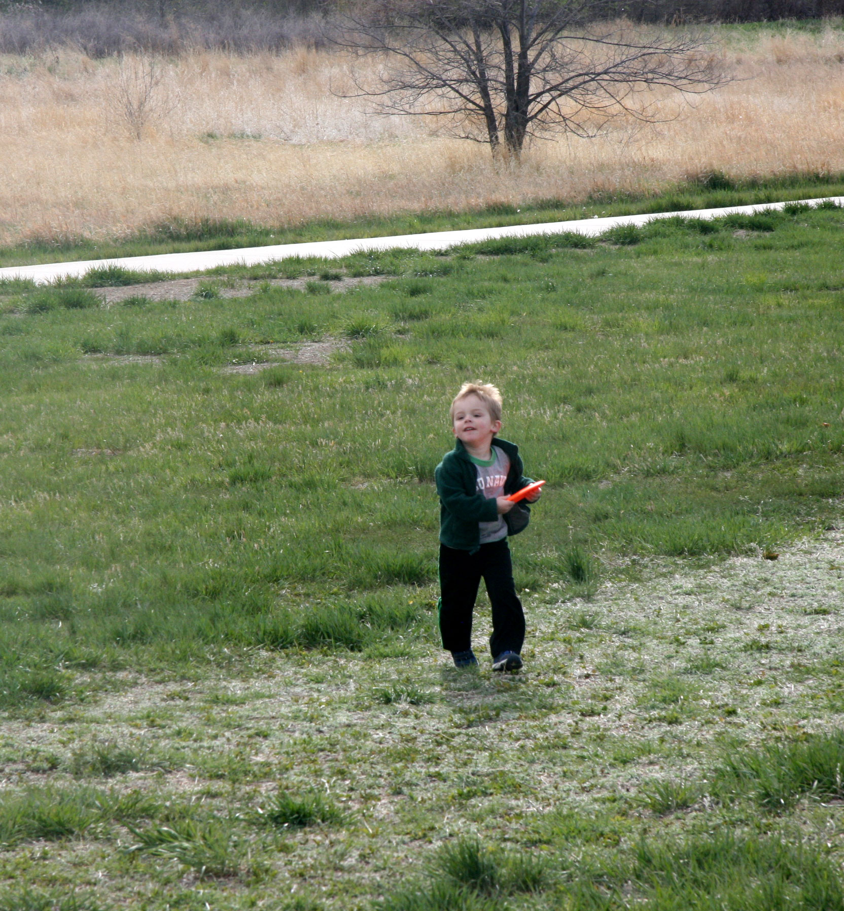 He’s not too excited about the possibilities of frisbee golf yet. Davey and I are still working on recruiting him onto Frisbee Team Bieloh. (But isn’t the sky pretty and look at Davey ready to run.)
