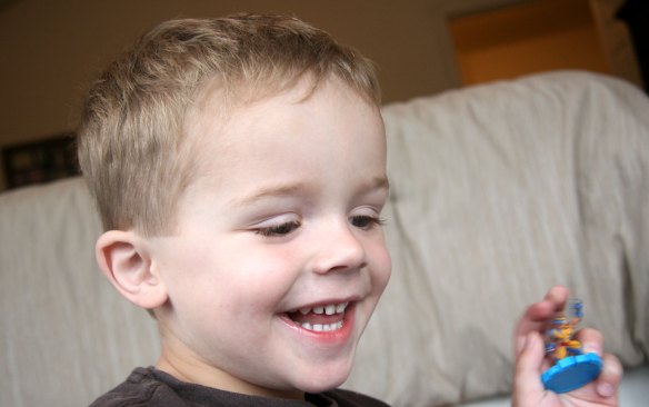 These are little superhero and supervillain guys. There is a game with rules that goes along with the clix. Davey is not too interested. He likes to set them up with Daddy and then they just have the little guys “clobber” each other.