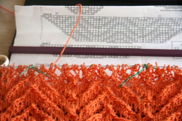 So then my shawl almost became a huge disaster. I tinked back 100 stitches and then I didn’t have enough stitches on my row and ugh…I was getting worried. But thankfully there was this stitch sequence of “slip 1, k2tog, and psso” So I could find where these were in my row which helped me find my mistakes. I found where I’d dropped a couple of yarnovers and the green markers were where I needed to get them back.