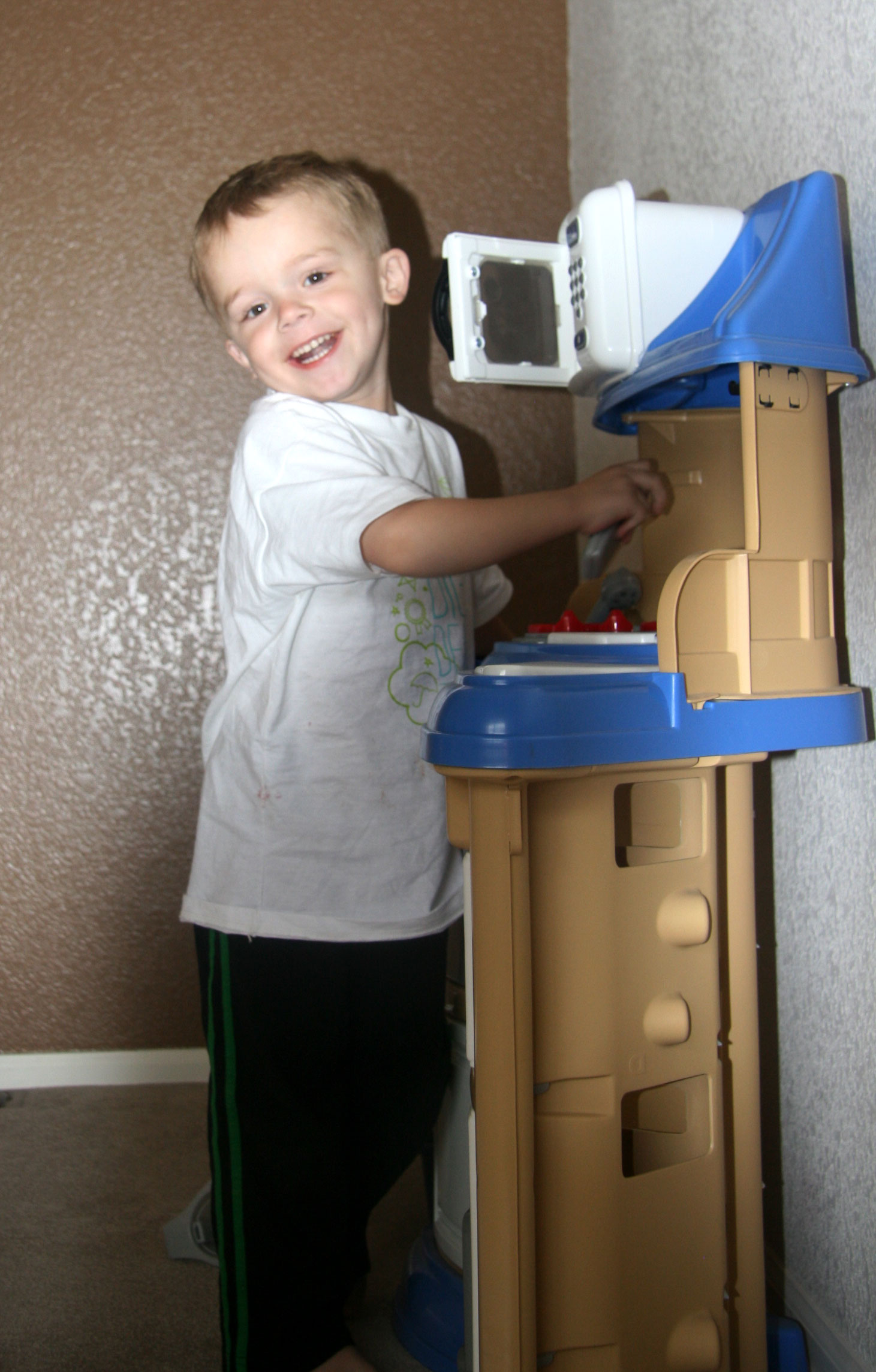 Thankfully he is more interested in doing sitting down activities (superheroes, tinker toys and race track), but he’s moving around some too.