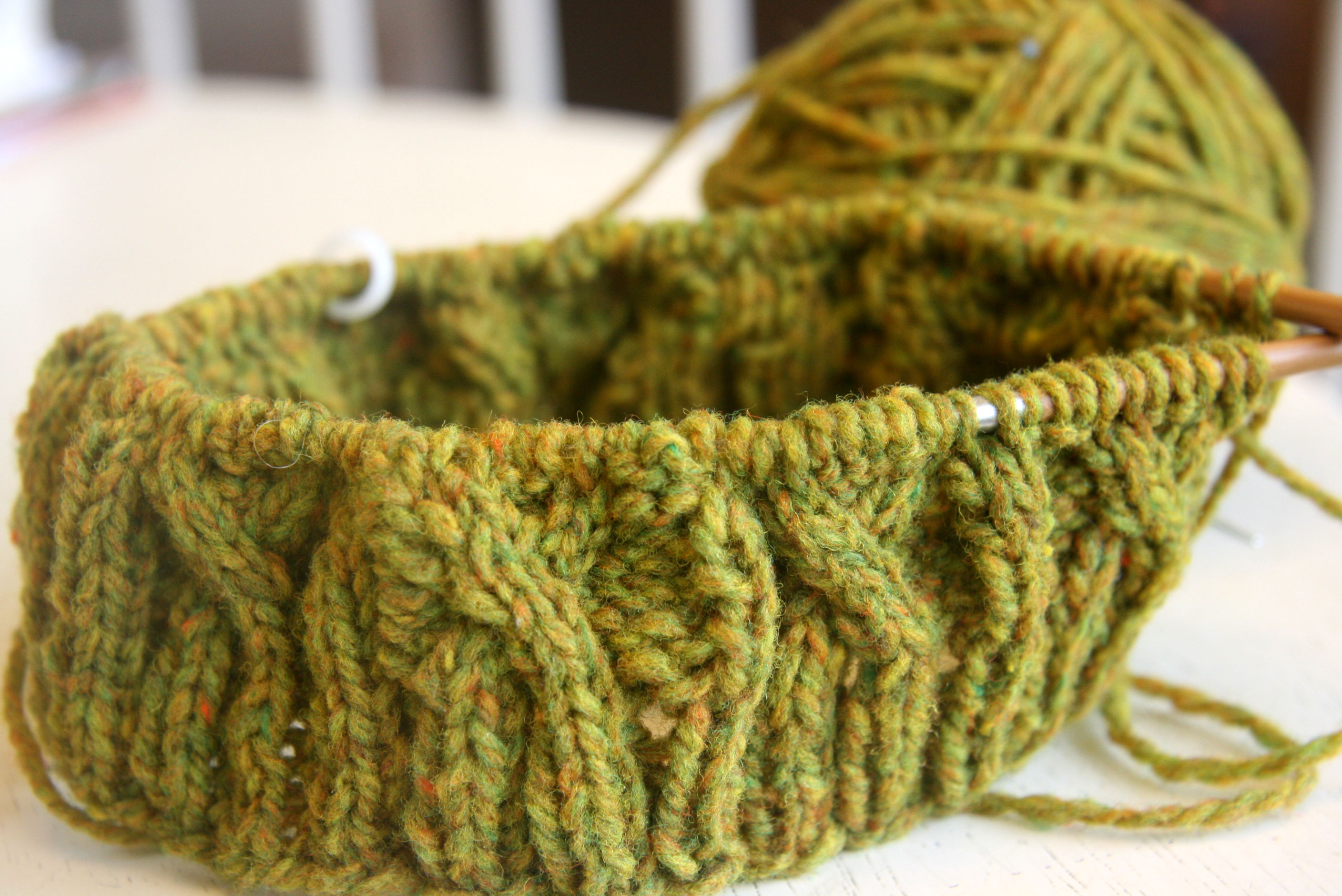 First I’m working on a very “cabley” hat. My friend Susan gave me the yarn. It’s the cool Shelter yarn by Jared Flood (his pattern as well). It’s not really soft but it feels really good. Kinda rustic, and every once in awhile I come across just a small piece of grass in the yarn. I love that.