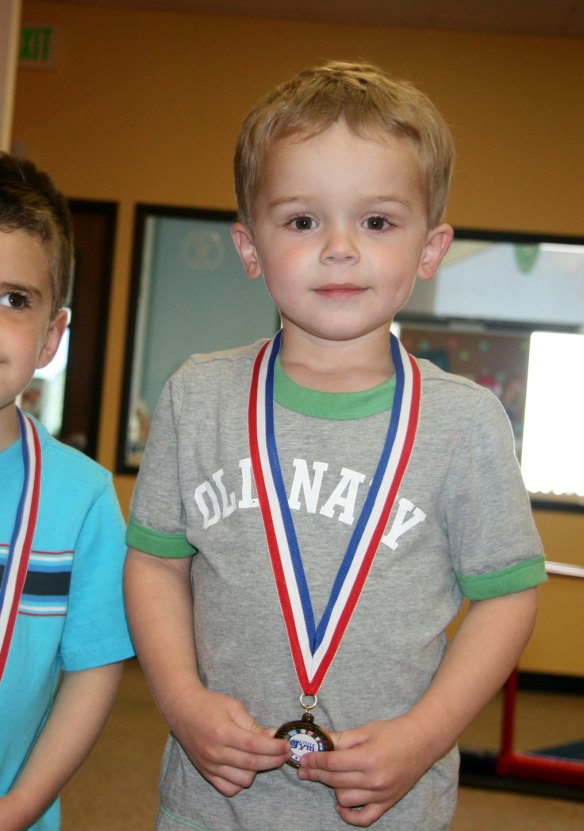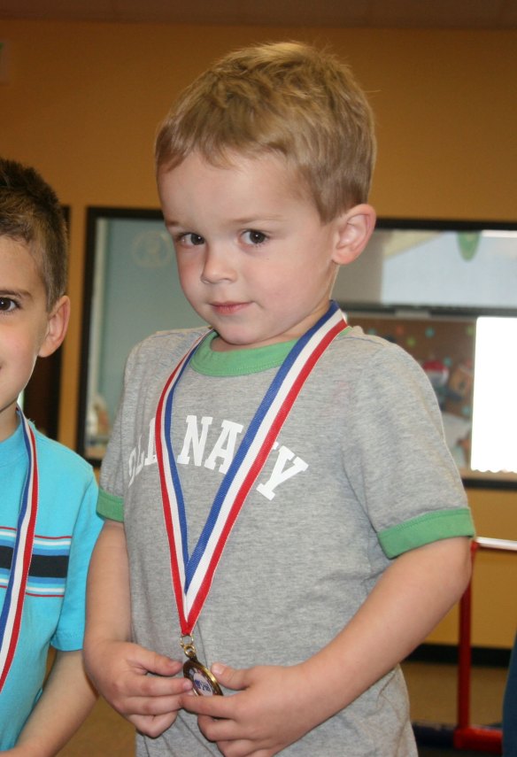 Here he is with his medal. He is proudly standing by one of his new friends (I cropped most of the friend out as I didn’t get permission to put his photo up).