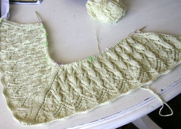 I am having a good time with the Wendy Johnson knit-a-long. I had a brief period of panic when I realized that I didn’t have enough yarn, and that the color had been discontinued, but I found it online and a skein arrived today. Yay.