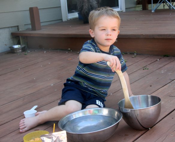 Davey was performing an experiment, and apparently it was serious business. (I also seriously need to sweep the porch. The wind howled last night and the yard was a mess this morning!)
