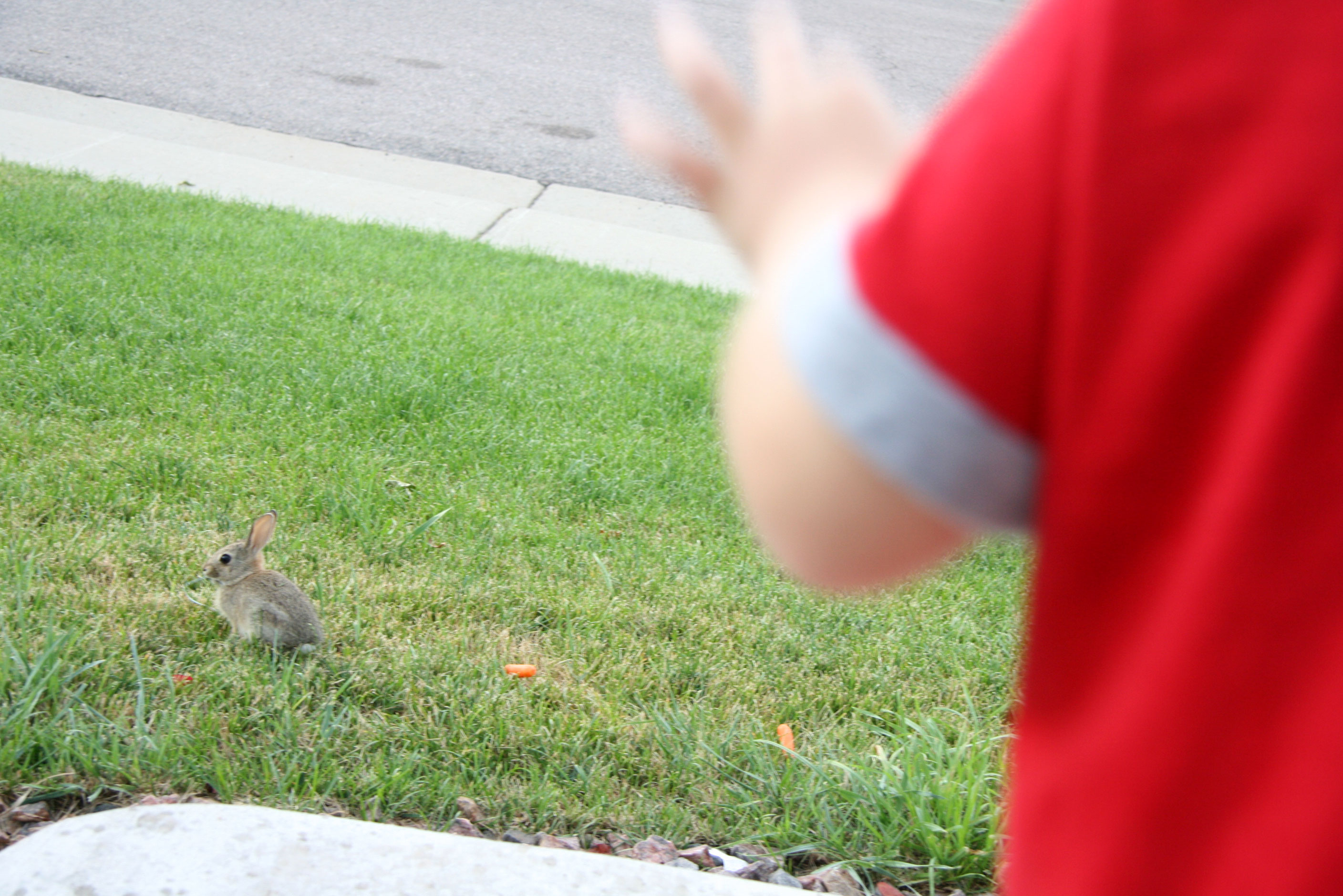 As we sat down on the front steps, we saw a baby bunny just a few feet from us.  Silly bunnies have very little fear.