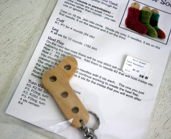 I found the cutest little keychain the other day. It’s a miniature sock blocker. You knit a sock to go on it. I can’t wait to do this.