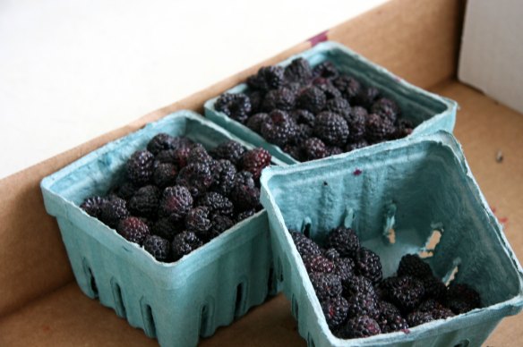 Berry picking always seems like such a sweet frolic. I never fail to romanticize the whole process. In my mind, the berries jump into my basket. I am now making a point to remind myself for once and for all. This is not true. Today there were mosquitoes (We sprayed but they were around). The raspberry bushes were very thorny. The black ripe raspberries were hiding in the center of the bushes. My arms can tell the tale of my struggle to get to them. The Berry Patch website had recommended wearing long sleeves. It wasn’t that hot, but I really didn’t feel like long sleeves. I should have worn them. Next time I will (next time?!?).