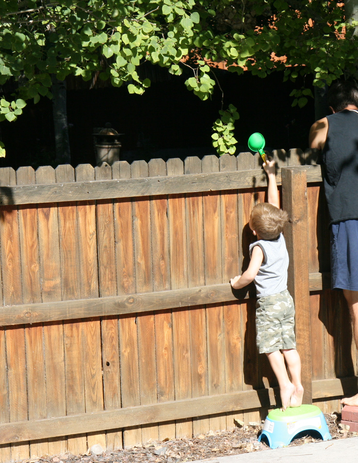 David and Davey were playing basketball in our backyard, when they accidentally threw the ball into the neighbor’s yard. (I have been asked to edit this to explain that the ball actually BOUNCED into the neighbor’s yard.)
