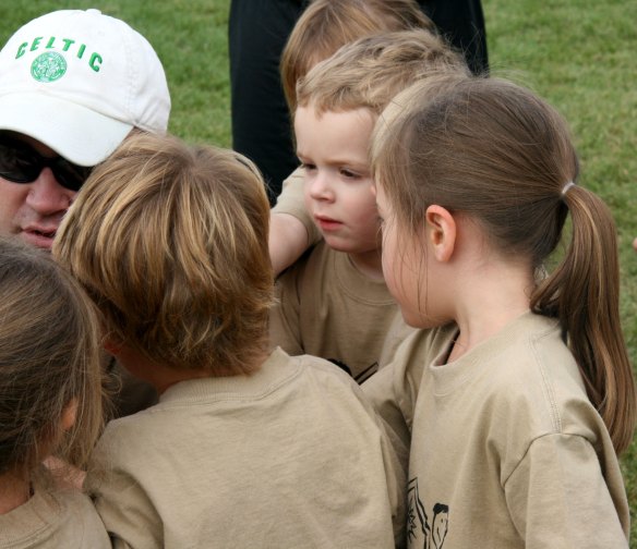 So they ran around for awhile and it was all great fun.  At the end, they huddled up.  Davey was still focused.