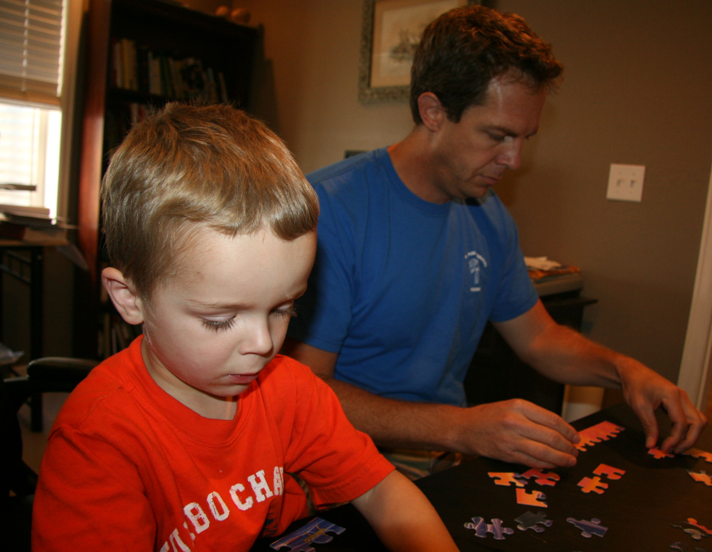 Davey received a puzzle as a gift recently. It’s a 1,000 piece puzzle, but we decided to dive right in. We quickly got overwhelmed and so Davey and I ran to KMart for a 100 piece and a 300 piece puzzle. We are in training. Davey wanted the 100 piece glow in the dark puzzle. It’s pretty neat. Now we are working on the 300 piece Toy Story poster puzzle. Davey likes to help me look for edges. I like this picture of David and Davey working together with their similar expressions (although a little hard to see with this too dark photo).
